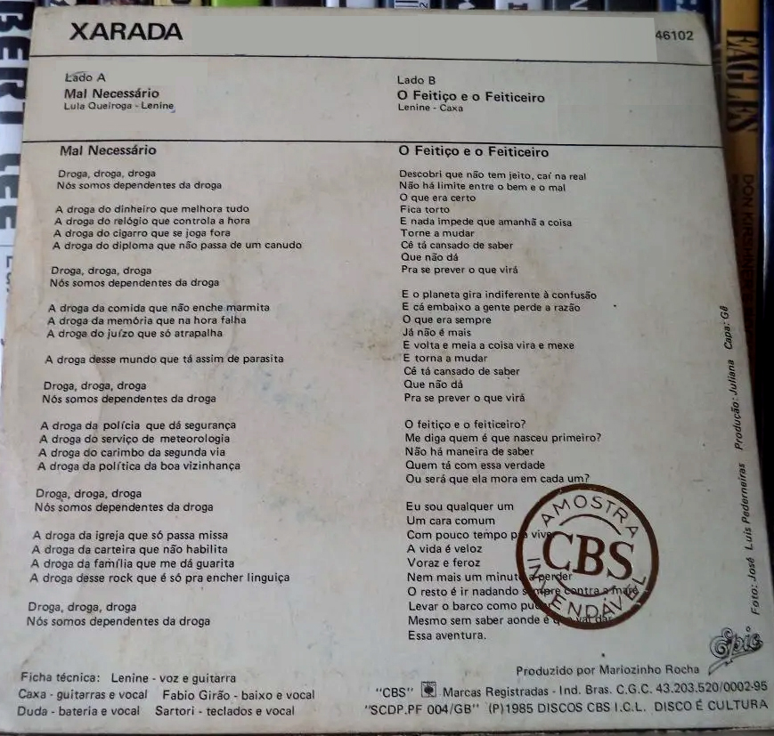 Este raro disco – produzido por Mariozinho Rocha e lançado pela Epic/CBS em 1985 – trazia duas composições de Lenine com seus frequentes parceiros Lula Queiroga (no lado A, em “Mal necessário”) e Caxa Aragão (no lado B, com “O feitiço e o feiticeiro”).